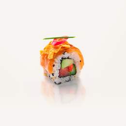 Parte superior: tartar de atún picante, mayonesa picante, cebollino, copos de tabasco. Interior : gamba en tempura, aguacate, mayonesa goma ponzu