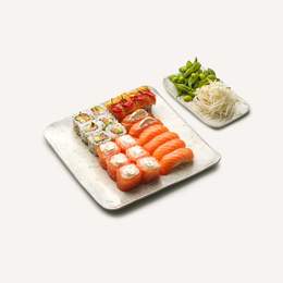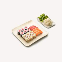 3 nigiri salmón2 nigiri atún6 california salmón y aguacate6 maki atún Edamame / Ensalada de col
