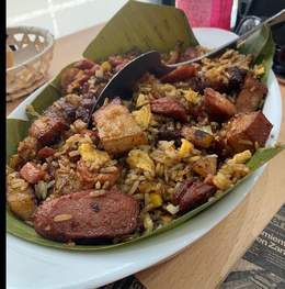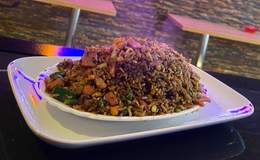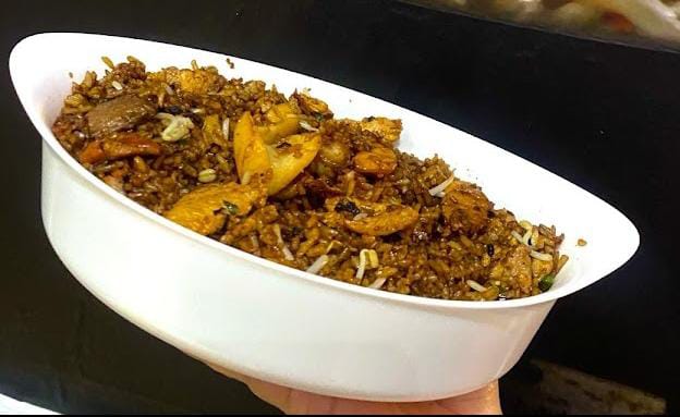 Arroz fusión clásico salteado al wok con gambas, cerdo, jamón, tortilla de huevo y raíces chinas