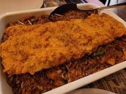 Salteado con cerdo, pollo, salchicha ranchera, jamón ahumado, tortilla de huevo y maíz tierno
