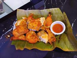 Salteado con gambas, trozos de pollo en especias chinas, tortilla de huevo, raíces chinas y salsa agridulce o sweet chili