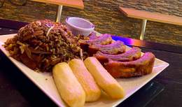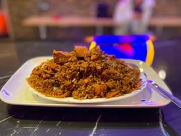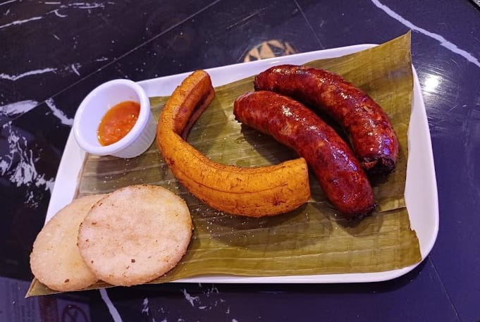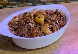 Salteado con costilla de cerdo, cubos de chicharrón, chorizo ahumado, salchicha ranchera, salchichón, panceta ahumada, maduro, maíz tierno y tortilla de huevo