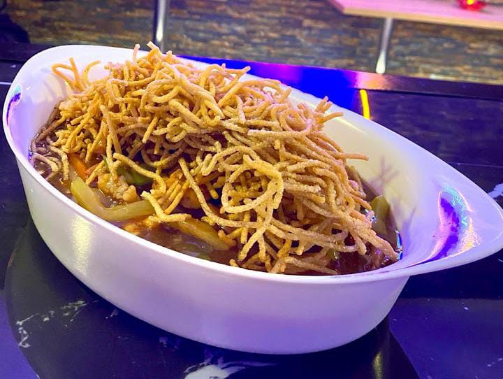 Salteado con langostinos, camarón, calamar, res, cerdo, pollo, jamón, tortilla de huevo y raíces chinas