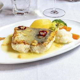 Lomo de merluza en parrilla con Bilbaína ligera.