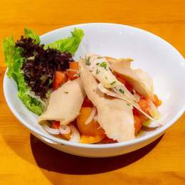 Lechugas variadas, pollo picantón, queso Parmesano, picatostes y salsa Cesar