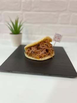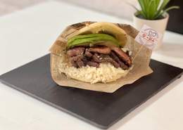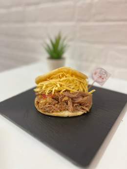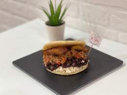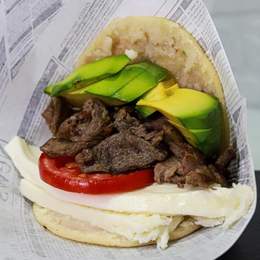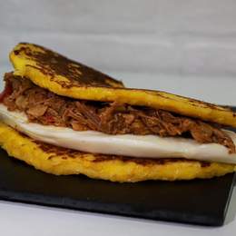 Plátano verde frito aplanado como base y encima queso amarillo gouda, carne de ternera desmechada, frijoles negros, aguacate y ensalada rallada (coleslaw).