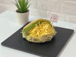 Plátano macho verde aplanado frito como base y encima queso blanco latino, ensalada rallada, (coleslaw) y salsa rosada