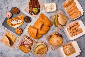 Plátano macho verde aplanado frito como base y encima queso blanco latino rallado, carne de ternera desmechada, frijoles negros y aguacate.