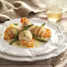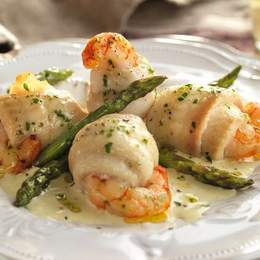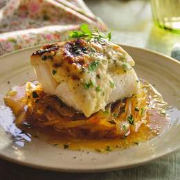 LENGUADO GRATINADO CON CEBOLLA Y GAMBAS