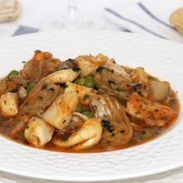 Este es un plato suculento y rico en matices marineros. Su base es un sofrito pochado a fuego lento al que se van incorporando el resto de ingredientes: el caldo de pescado y, por supuesto, el mero y el calamar.