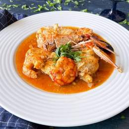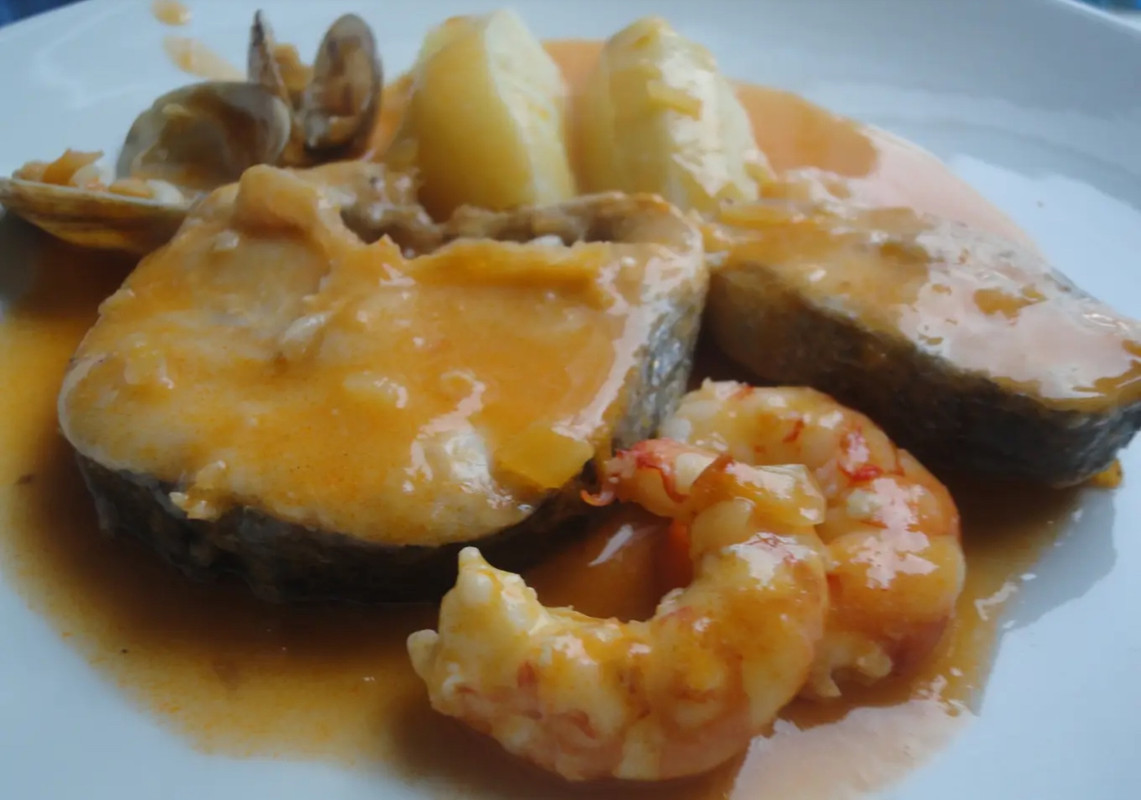 Rape cocinado en una rica salsa marinera, realzando su sabor delicado y textura firme