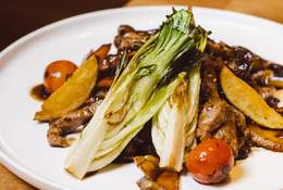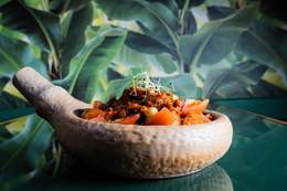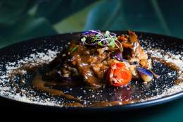 a la brasa sobre duo de arroces salteados con verduritas, emulsión de teriyaki y ponzu, guacamole (de aguacate de la Comunidad Valenciana) y terminado con reducción hoisin. Sin gluten.