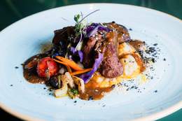 cocinada a baja temperatura 85ºC con salsa de vino tinto y espuma de patata.