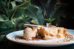 caramelizada con helado de turrón de Jijona y almendra crocanti.