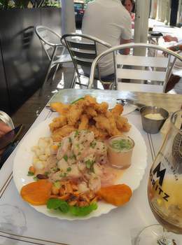 suaves cortes de corazón de ternera, patatas doradas, salsa huancaína y choclo