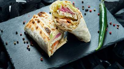 Pan tortilla 25 cm, kebab pollo y ternera casero receite original Mediterraneo, queso mozeralla fresh, queso cheddar, Queso feta, cebolla Roja, remolacha pepino zanhoria, lechuga y salsa blanca especial estilo griego light creamy garlic Mayo