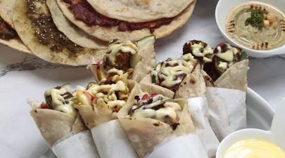 Shawarma de pollo, aguacate, queso, miel y Mostaza, enslada mixta libanese y salsa Blanca