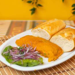 Pan con Tamal de Cerdo y Ensalada de Cebolla Morada