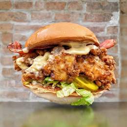 Fried chicken (pechuga de pollo empanada crujiente) acompañada de salsa Bourbon, bacon, queso cheddar, pepinillos y lechuga