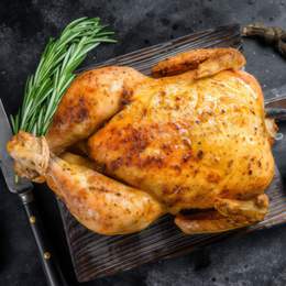 Pollo asado en su propio jugo y acompañado por una sabrosa salsa a base de vino oloroso y hierbas aromáticas.