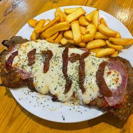 Carne de ternera rebozada en pan rallado, salsa tomate, mozzarella, jamón york, pimientos asados y patatas fritas