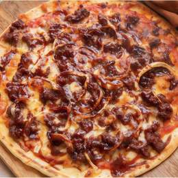 Salsa tomate, mozarella, bacon ahumado, cheddar, pollo, cebolla morada y orégano