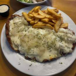 Carne de ternera rebozada en pan rallado,mozzarella, provolone, queso azul, parmesano y patatas fritas