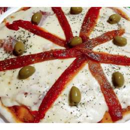 Salsa de tomate, mozarella, jamón york, pimientos asados y olivas negras
