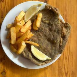 Carne de ternera rebozada en pan rallado, limón y patatas fritas