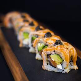 Rollo de salmón, aguacate y queso crema con salsa de sésamo. /8udsOpción asado: Wakame, salsa de sésamo, sweet chilly, aceite trufado y cebolla crujiente