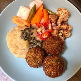 Bowl de falafel con babaganoush, coliflor crujiente, semillas de calabaza y pickles de verduras
