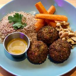 Falafel Bowl con tabulé de bulgur integral, zanahoria rostizada con miel y mostaza y nueces