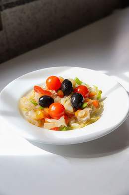 Bacalao, olivas negras, pimiento rojo y verde, cebolla y tomate
