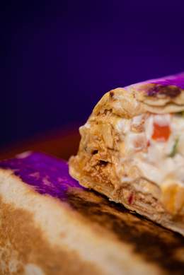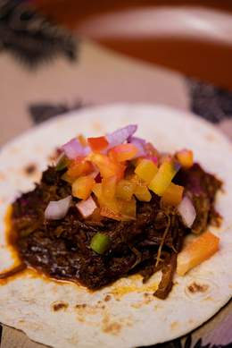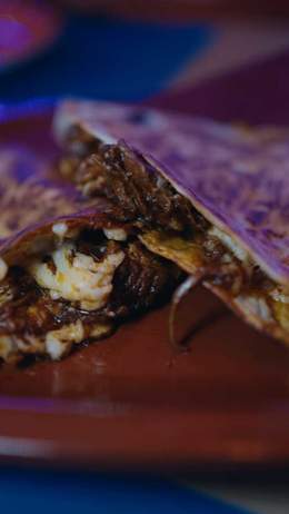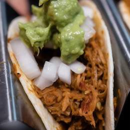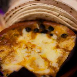 Torta de trigo (30 cm.), arroz salvaje, carne de cerdo guisada con achiote a baja temperatura, mozzarella, pico de gallo, lechuga, guacamole sour cream y cheddar fundido