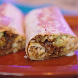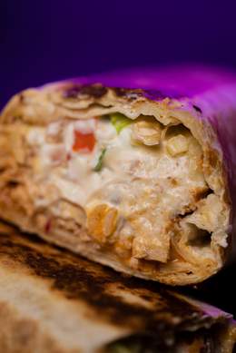 TORTA TRIGO 30CM ENROLLADA CON CARNE DE BIRRIA RES, ARROZ SALVAJE, LECHUGA,CHEDAR, GUACAMOLE, SOURCREAM Y PICO DE GALLO