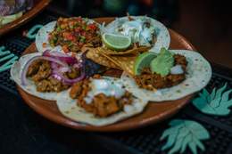Cochinita pibil con mozarella fundida, acompañada con tortas de trigo y nachos