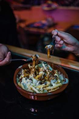Tortitas maíz fritas, cochinita pibil, mozzarella y cheddar fundida, jalapeños, picó de gallo, guacamole y sour cream