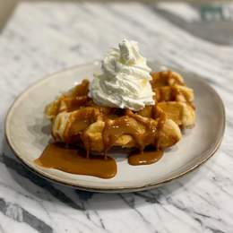 Auténtico gofre belga recién hecho, crujiente por fuera y suave por dentro, espolvoreado con azúcar glas, añade tu salsa favorita!
