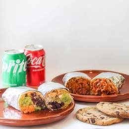 Combinación para compartir y disfrutar: 2 burritos a elección (clásico de pollo, picantón de ternera o veggie), acompañados de 2 bebidas a tu gusto y de cierre, 2 cookies artesanales como postre. El dúo perfecto con sabor y buena compañía.