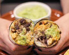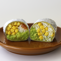 Delicioso burrito 100% vegetariano relleno de arroz blanco, guacamole cremoso, maíz dulce, hummus, tomate fresco y un toque de crema.