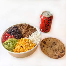 Una experiencia completa: disfruta del Bowl Supremo con cerdo BBQ jugoso y lleno de sabor, acompañado de una bebida refrescante y una cookie artesanal como toque dulce final. ¡Perfecto para los que buscan saciar el hambre con estilo y contundencia!