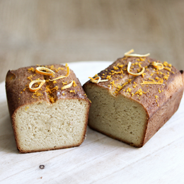 Hecho a base de harina de almendra, huevo, extracto natural de naranja y vainilla, con ralladura de naranja