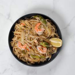 Tallarines al de arroz al estilo thai salteados con gambas, brotes de soja huevo, col china, cacahuete y sésamo. Servido con lima