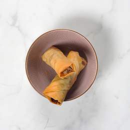 Roll tempurizado relleno de pato acompañado de salsa crispy