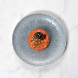 Cono de alga nori y arroz relleno de nuestro mejor salmón macerado en nuestra especial salsa picante
