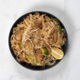 Tallarines al de arroz al estilo thai salteados con pollo, brotes de soja huevo, col china, cacahuete y sésamo. Servido con lima