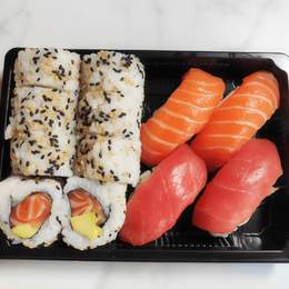 8 salmón roll, 2 sushi atún y 2 sushi salmón