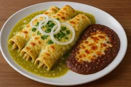 Tres tortillas de maíz auténtico rellenas de pollo, acompañado con frijoles y salsa a elegir