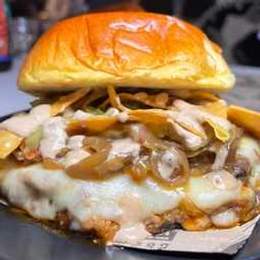Pan brioche 100g potato roll, carne de res desmechada al puro estilo de la tringa mexicana, frijoles refritos. Queso mozzarella, cebolla caramelizada, crujientes nachos, guacamole y nuestra crema de chipotle!!La Tinga, Pringa!!! 100% recomendable.