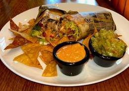 Burrito de pollo desmechado con mayonesa de chipotle, frijoles, queso, pico de gallo y lechuga servido con guacamole y mayonesa de chipotle casera